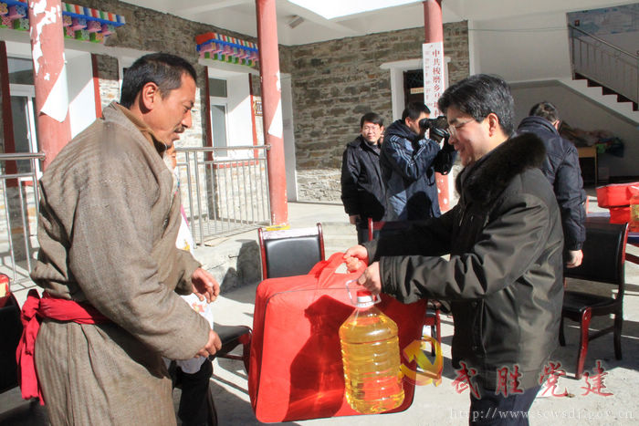 为深化援藏党支部“三共建一扶持”活动,结合马尔康县委近期中心工作,2月4日至5日,广安市援助马尔康县党支部成员在援藏党支部书记、马尔康县委副书记张超和援藏党支部副书记、县委常委、副县长黄运江的带领下,深入梭磨乡马塘村、马尔康镇阿底村、梭磨乡阳日岗寺开展送温暖、献爱心慰问活动。援藏支部为梭磨乡马塘村、马尔康镇阿底村的贫困户、贫困党员、老党员、老干部共20户,送去毛毯等御寒物品和菜籽油等食物;给阳日岗寺送去了面粉、菜籽油等物品。援藏干部一行还与慰问对象拉家常,促膝交谈,了解他们在生产生活中的具体困难和对党委政府工作的意见和建议,引导鼓励农户调整产业机构,努力增加收入。慰问对象一致感谢党委政府和来自小平故里的干部们对他们的关怀和关心,让他们进一步感受到了党的温暖。僧人们表示将爱国爱教,持戒守法,助民为乐,全力维护藏区的稳定和谐。(陈志刚)