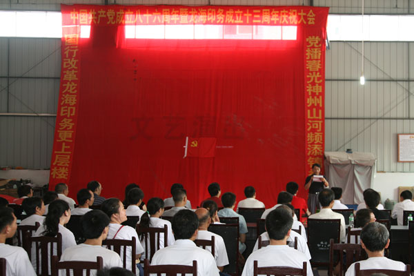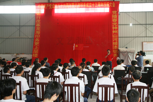 这天,异常整洁的龙海印务公司厂区彩旗招展,大幅鲜红背景下的党旗格外醒目。从上午9时开始,万千、天生等武胜县10户规模以上企业党组织负责人纷纷来到厂区,隆重集会,共同庆祝党的86周岁生日。